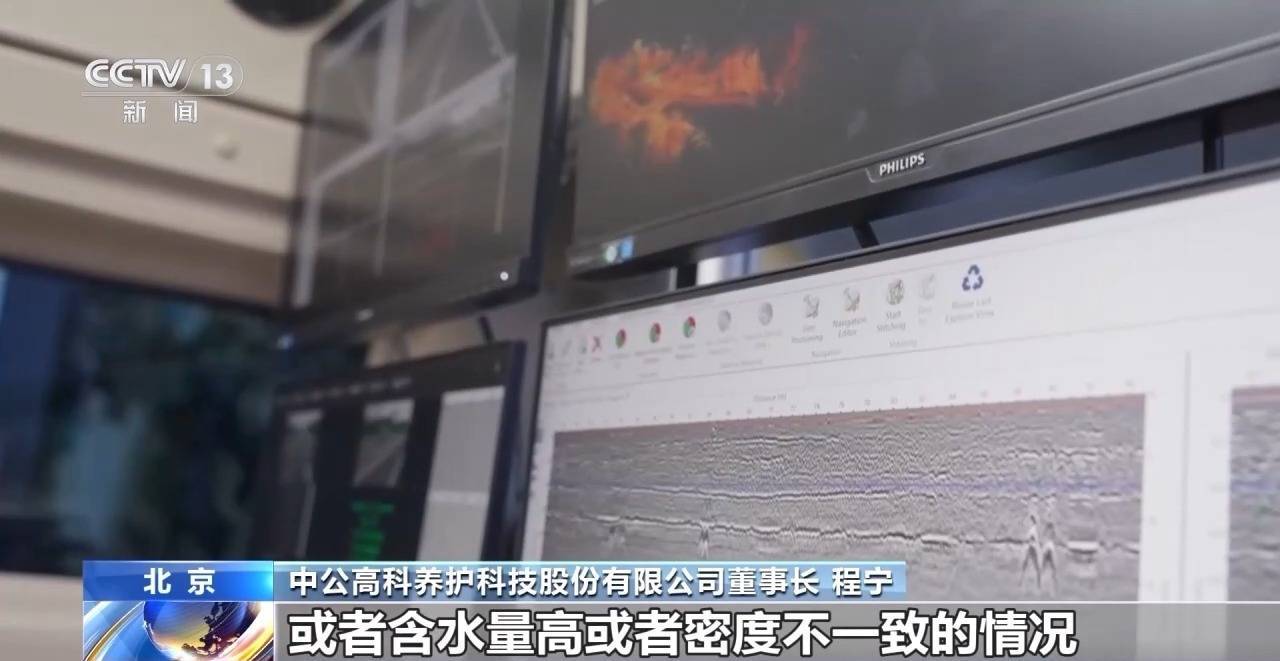 中公高科养护科技股份有限公司董事长 程宁:这块影像代表在这个点可能会有一些像坑槽、空洞、含水量高或者密度不一致的情况,相当于照B超。以前没有探地雷达就需要打孔,要专门在实地去做钻孔取芯,然后去实验室做检测。